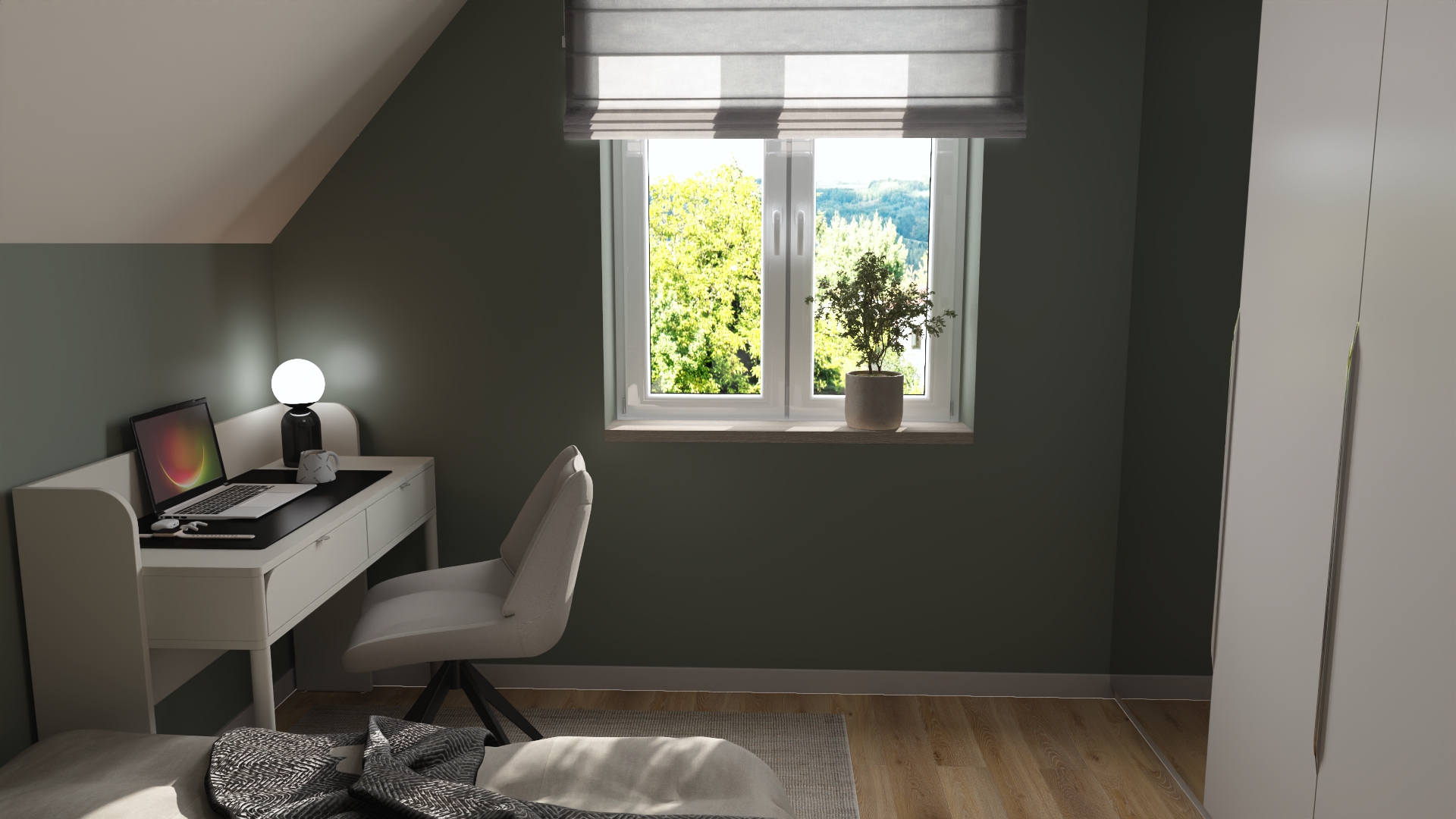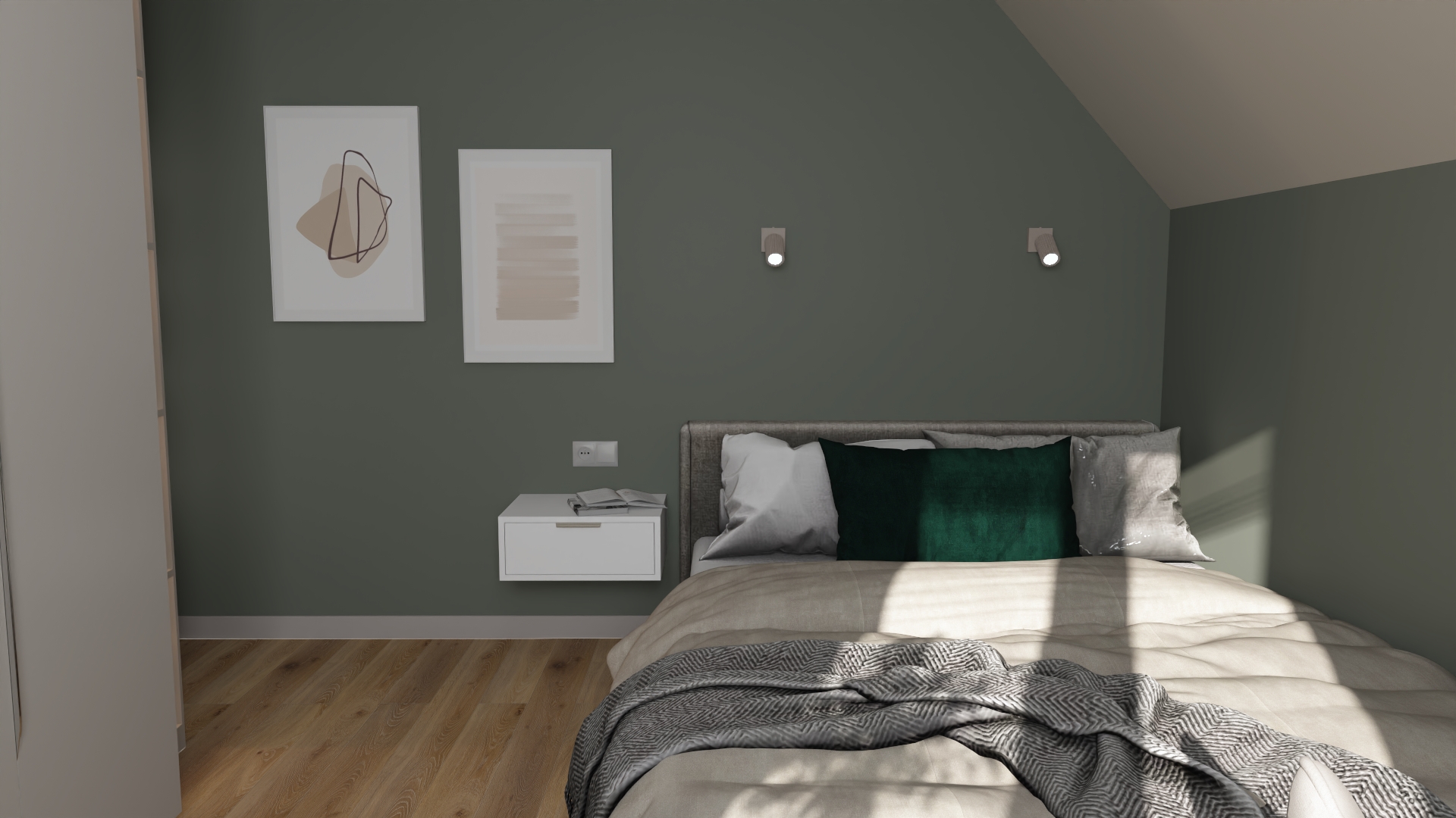 Projekt tej niewielkiej sypialni w domu jednorodzinnym opiera się na aktualnych trendach wnętrzarskich na rok 2026, w których dominują naturalne, spokojne kolory oraz przytulna atmosfera sprzyjająca odpoczynkowi. Bazę kolorystyczną stanowią delikatne pastele z subtelnym akcentem zieleni, które wprowadzają do wnętrza harmonię i poczucie świeżości.