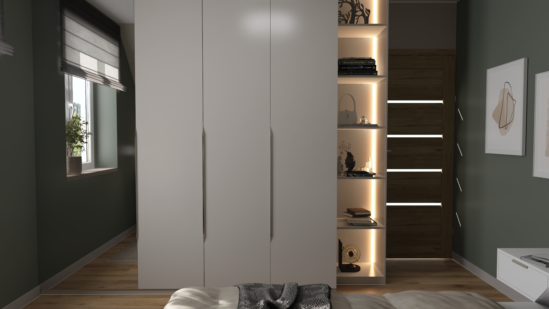 Centralnym elementem aranżacji jest zabudowa stolarska wykonana w eleganckim dekorze kaszmir, który od kilku sezonów pozostaje jednym z najchętniej wybieranych kolorów we wnętrzach nowoczesnych. Zabudowa została zaprojektowana w sposób maksymalnie funkcjonalny, dzięki czemu niewielka przestrzeń została w pełni wykorzystana. Zintegrowane oświetlenie LED podkreśla formę mebli, nadaje wnętrzu lekkości oraz tworzy nastrojowy klimat wieczorem.