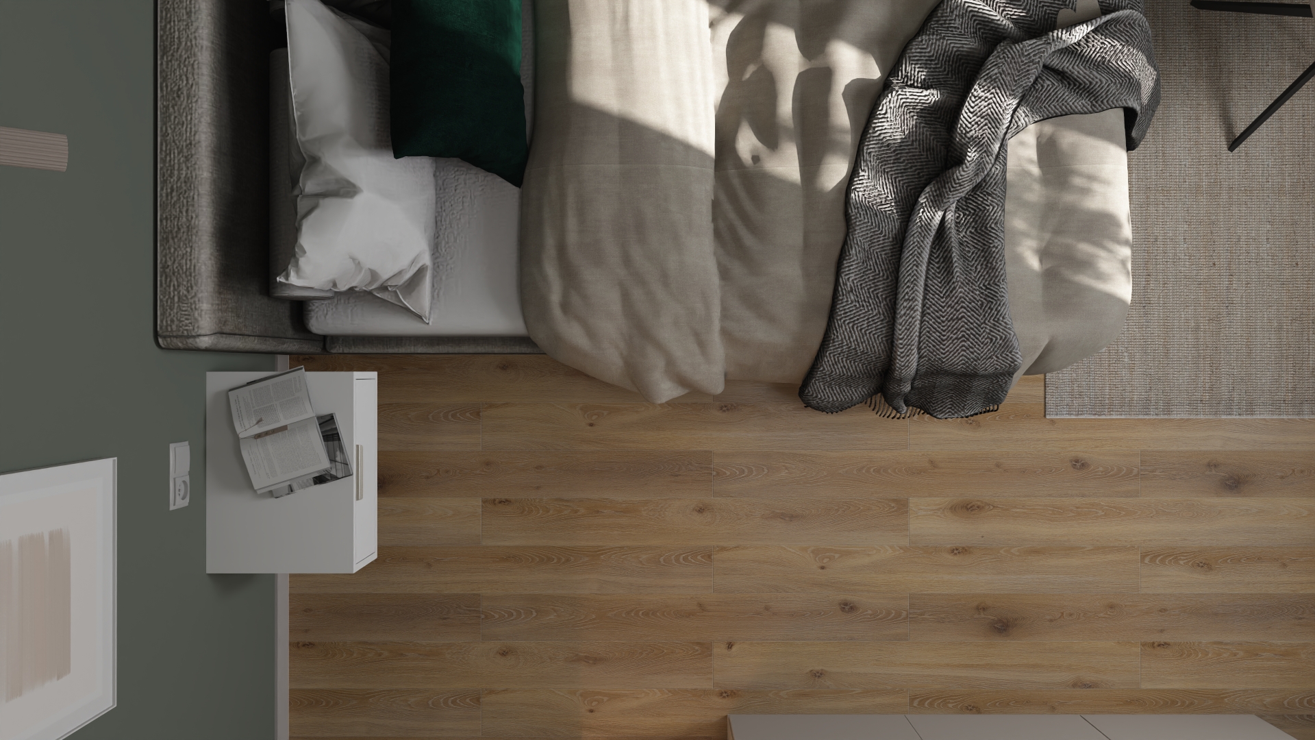 Na podłodze zaprojektowano wysokiej klasy panele o grubości 12 mm, które charakteryzują się podwyższoną trwałością i bardzo dobrą izolacją akustyczną. Ich naturalny dekor drewna ociepla całą aranżację i idealnie współgra z pastelową kolorystyką ścian oraz stonowaną zabudową meblową.
